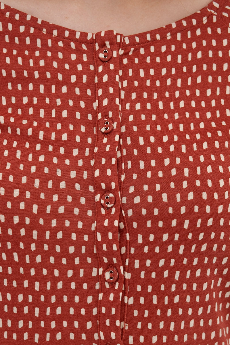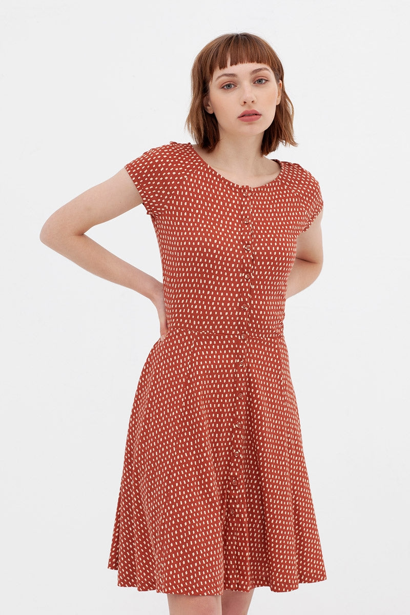El vestido Àdele con aire retro y manga ranglán, tiene corte en la cintura y es entallado. Lleva tapeta con botones funcionales. El color teja con estampado inspirado en Lucienne…