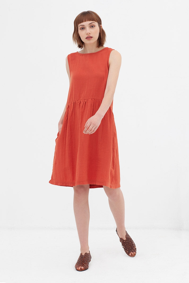 El vestido Ágata color teja es una prenda de lo más versátil… ¡es reversible!. Es un vestido holgado y muy cómodo además de romántico y delicado por su tejido de muselina.