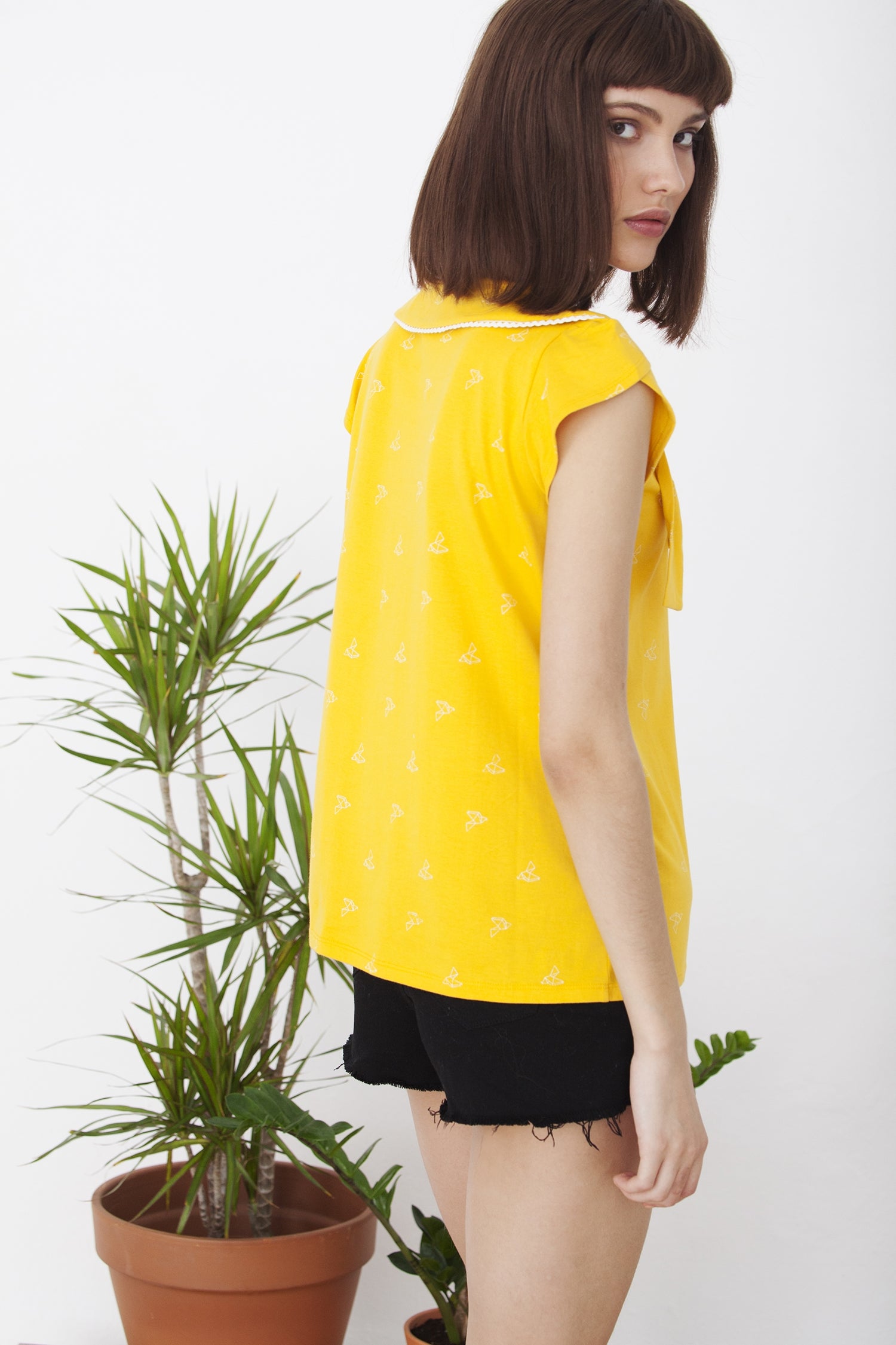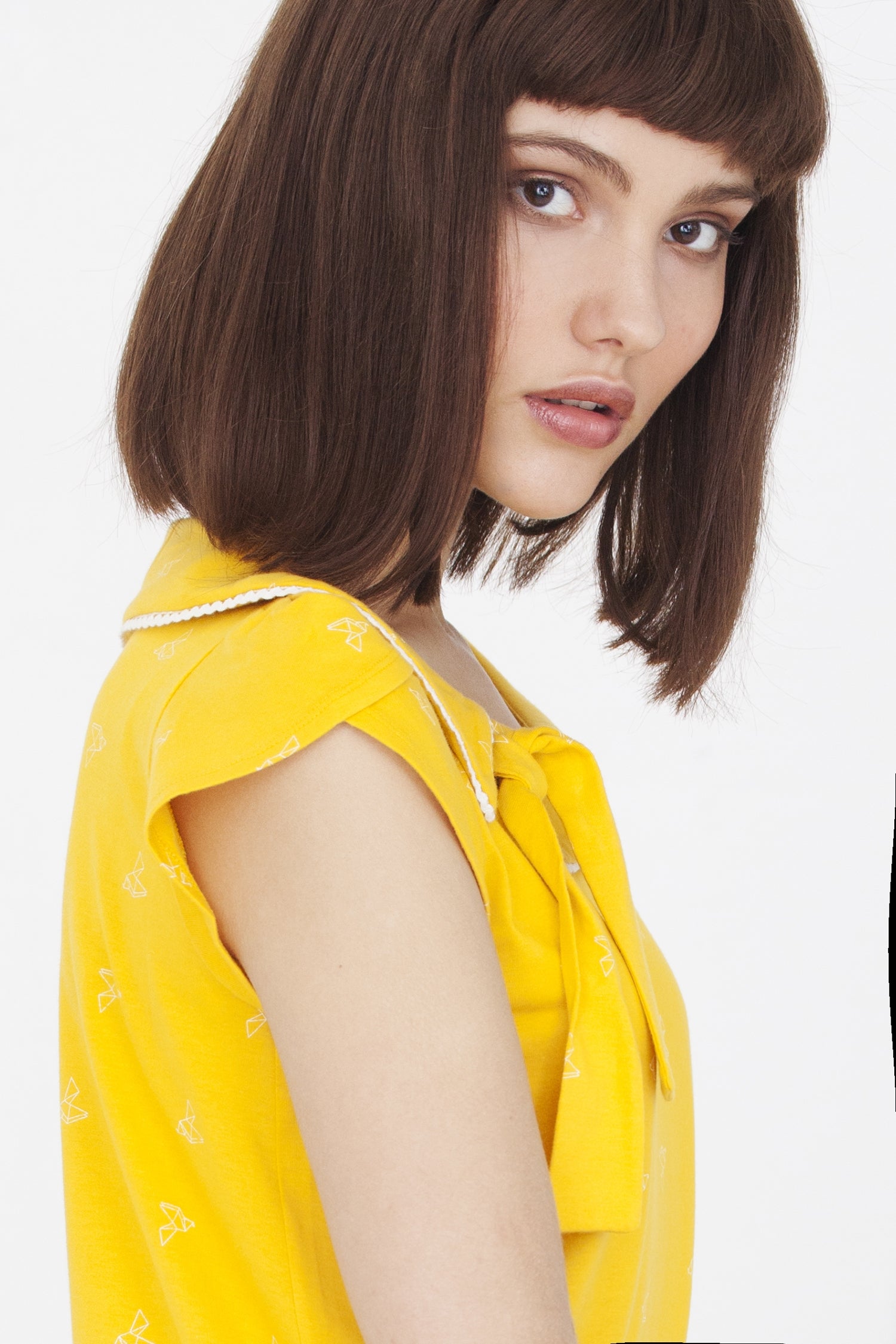 Yellow t-shirt with origami Hummingbird print . Off- shoulder neck with a small lace. 100% Organic Fairtrade Certified Cotton.
