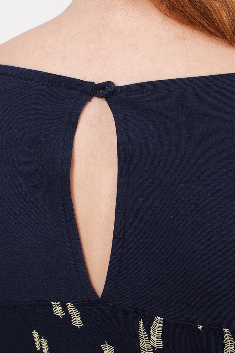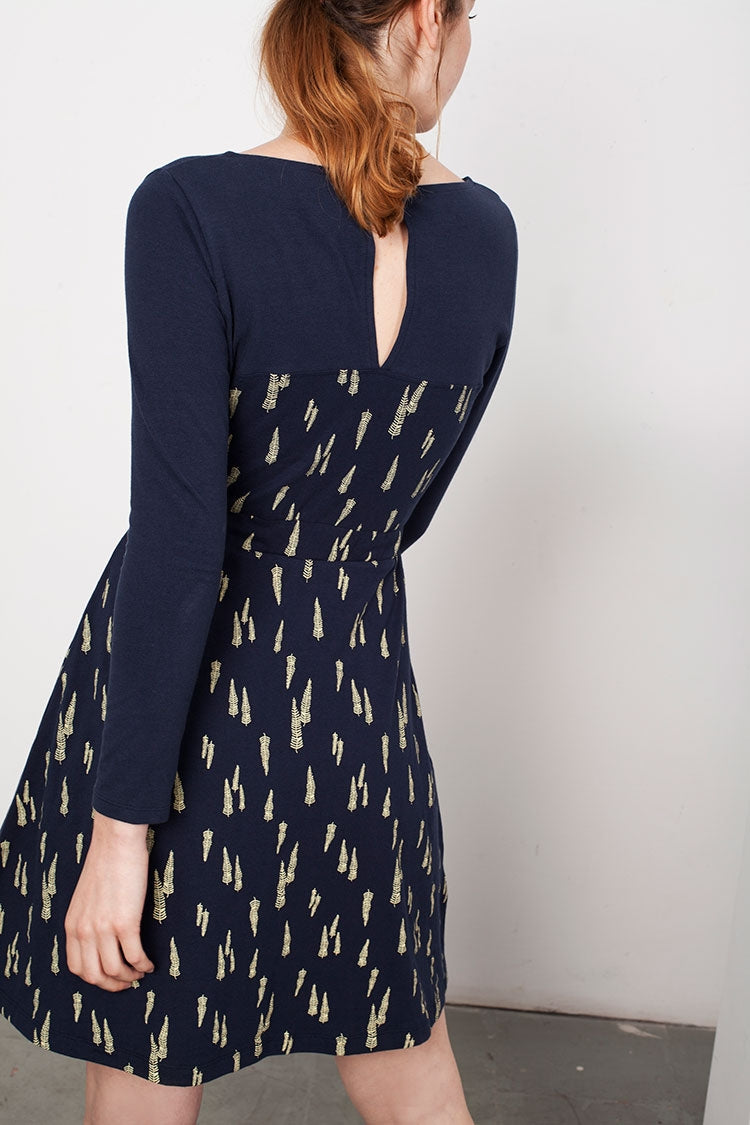Dress in navy blue with sleaves print combined with solid navi blue. Yoke detail. 95% Fair Trade Organic Cotton 5% Lycra.